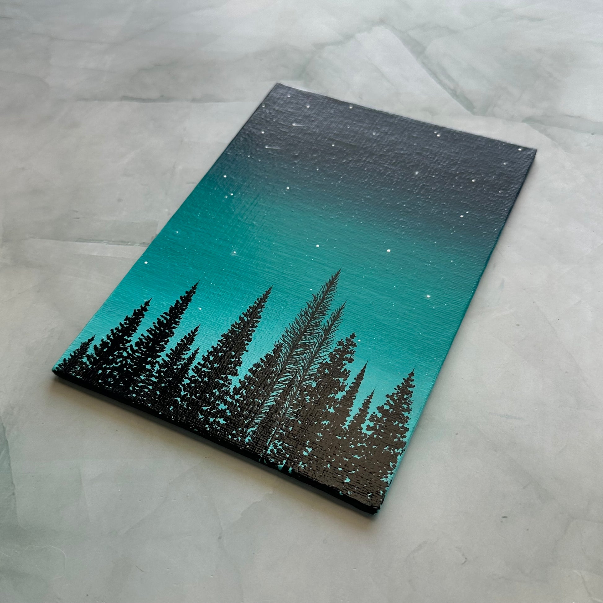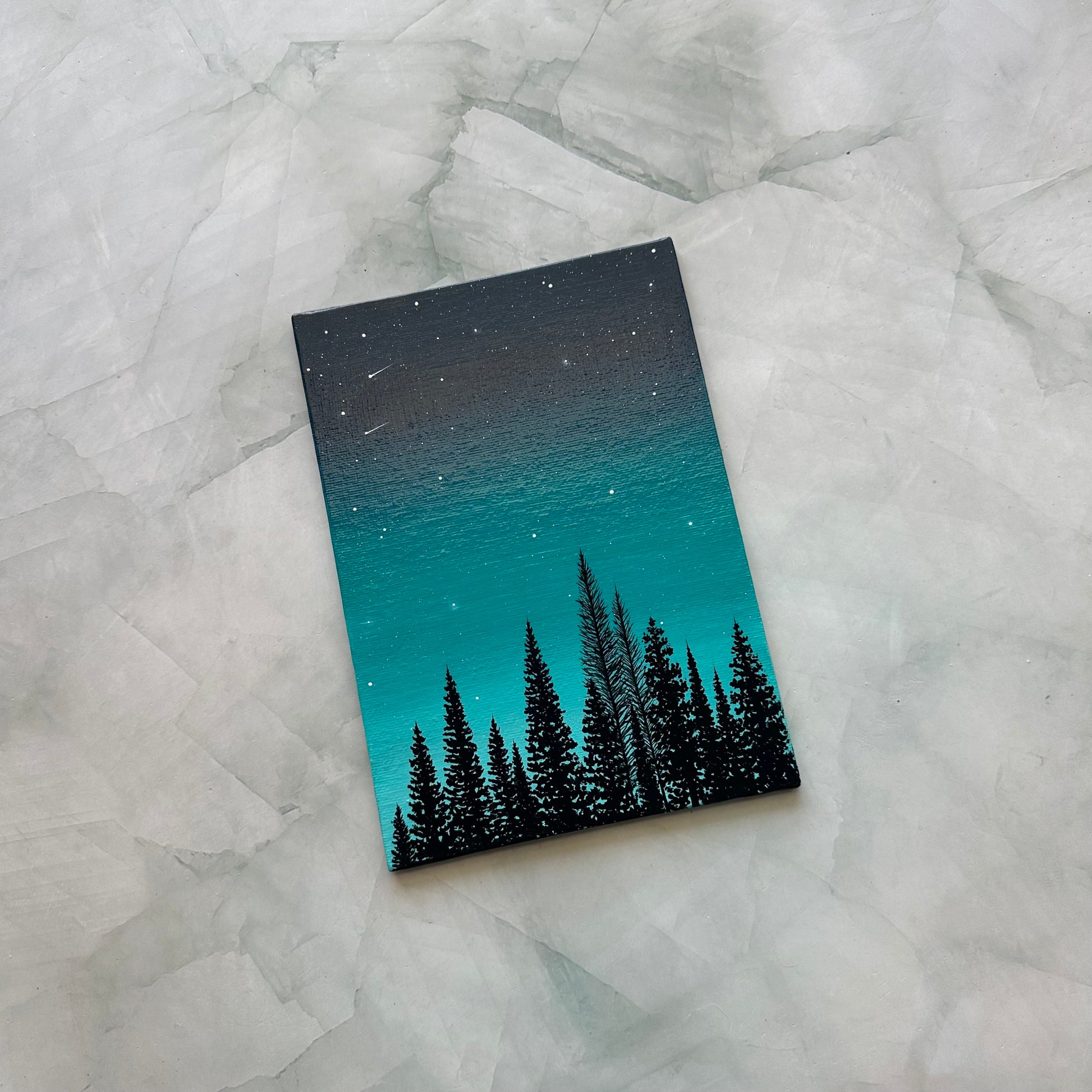 Painted on a canvas panel and signed on the back, this one-of-a-kind acrylic piece brings serenity, depth, and a dreamy pop of color to your space. 🌌🌲💫