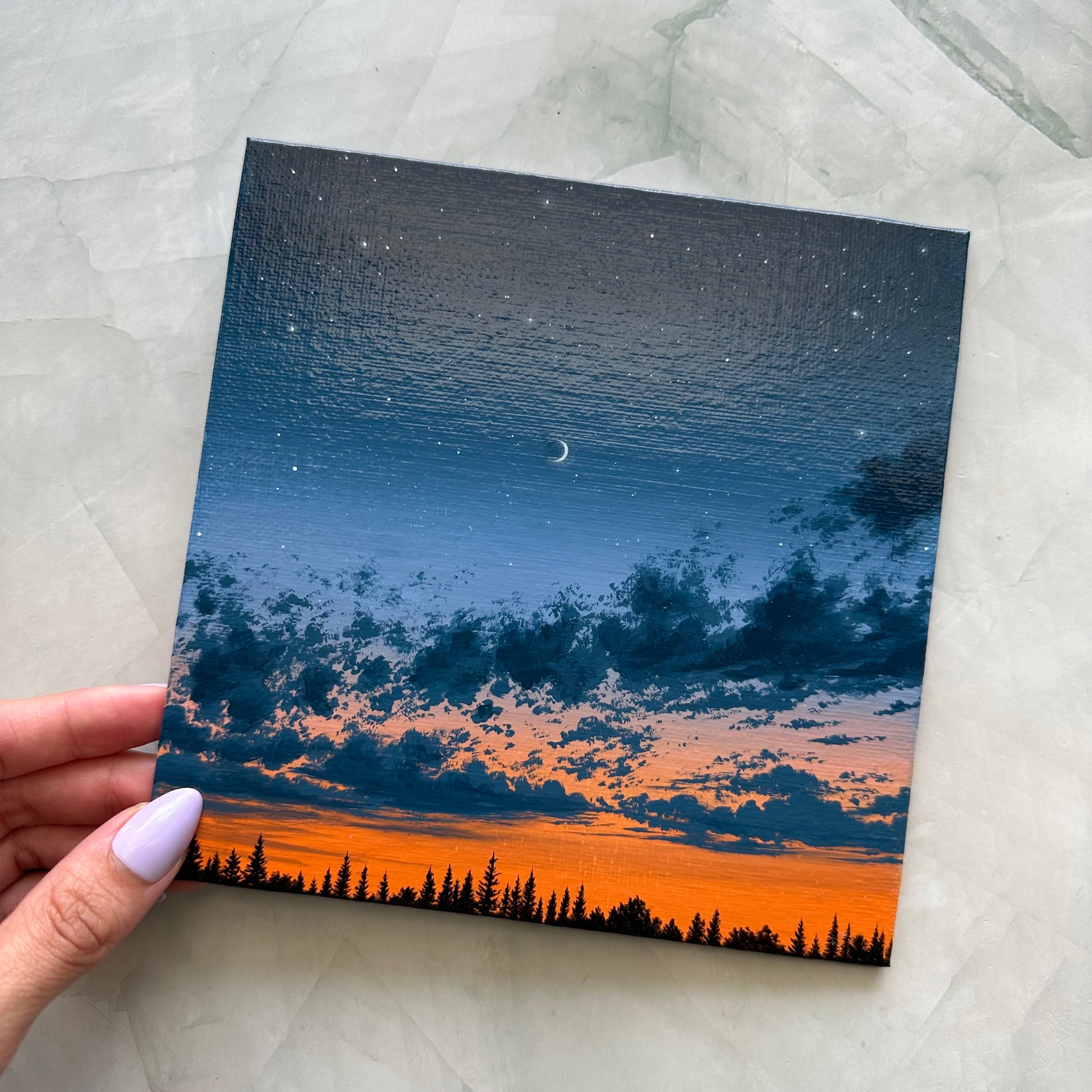Painted on a canvas panel and signed on the back, this one-of-a-kind piece brings the peaceful magic of twilight into any space. 🌙✨