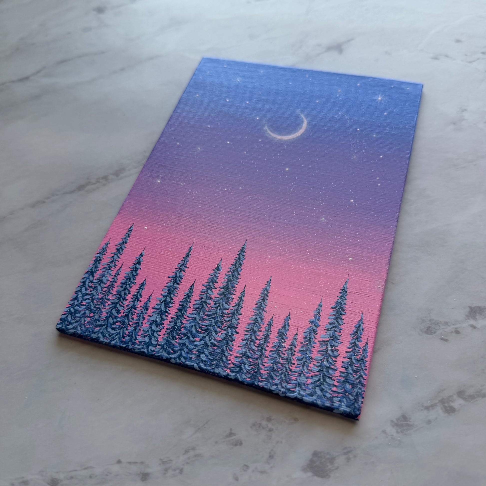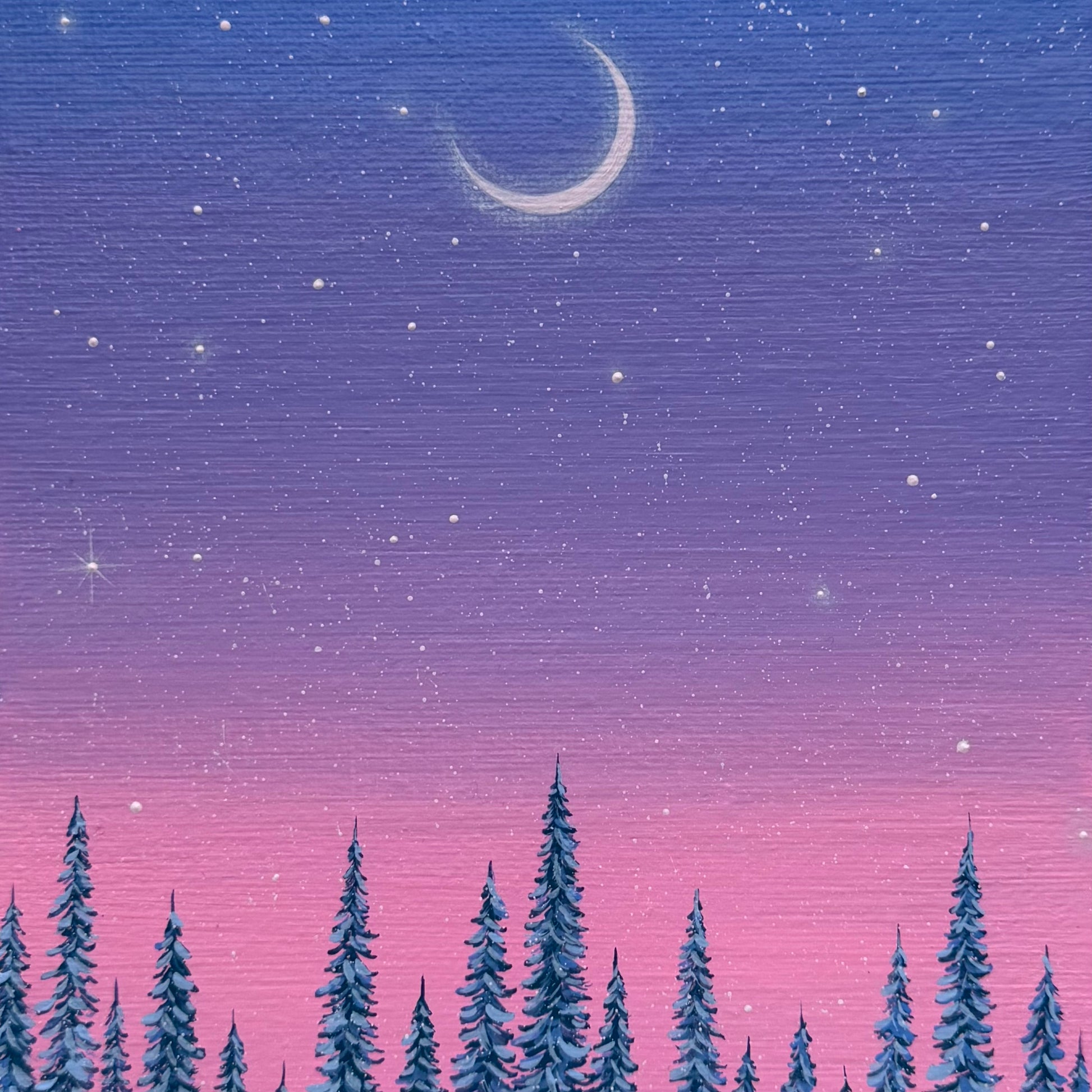 A soft crescent moon rests in a star-filled twilight sky above a quiet pine forest. Crescent Quiet captures a peaceful winter evening with gentle gradients of blue, violet, and blush pink, creating a calm, dreamy atmosphere.