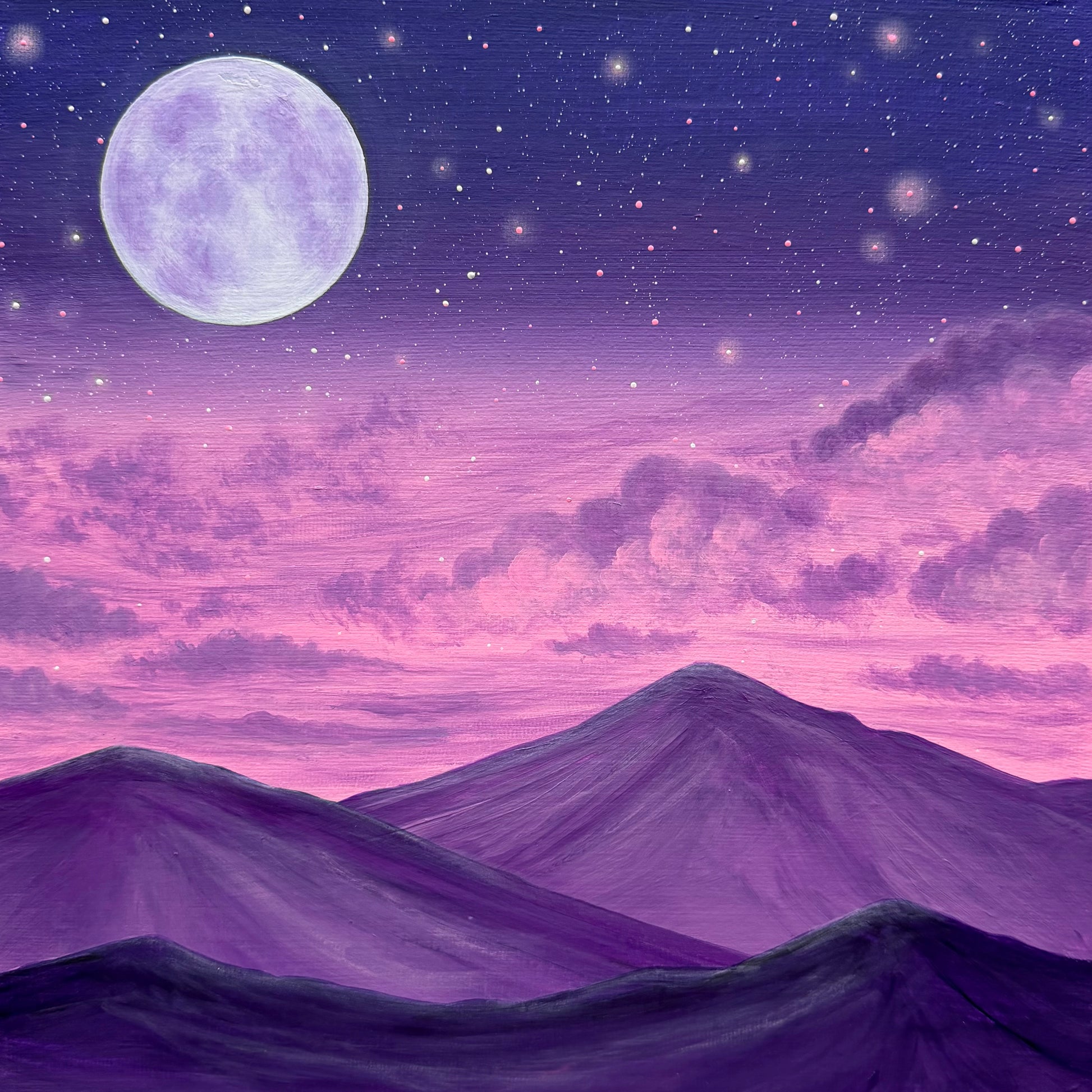Dreaming Beneath a Lilac Sky invites a quiet moment of stillness beneath a glowing moon and soft, starlit clouds. Layers of lilac, violet, and pink drift across the sky, settling gently over distant mountains and creating a calm dreamscape.