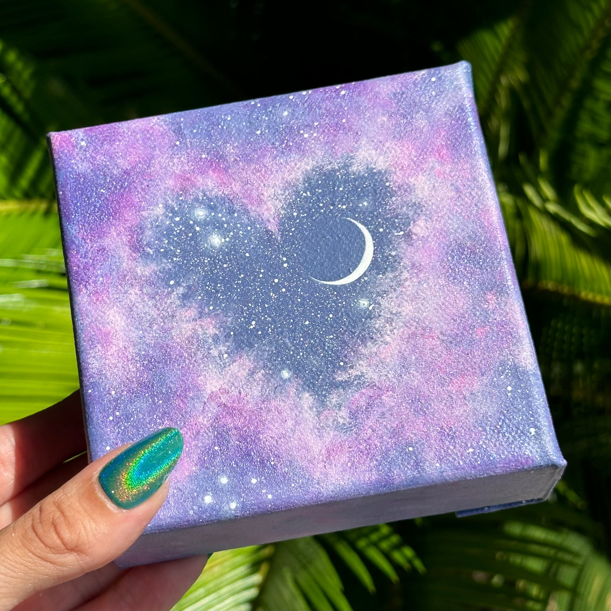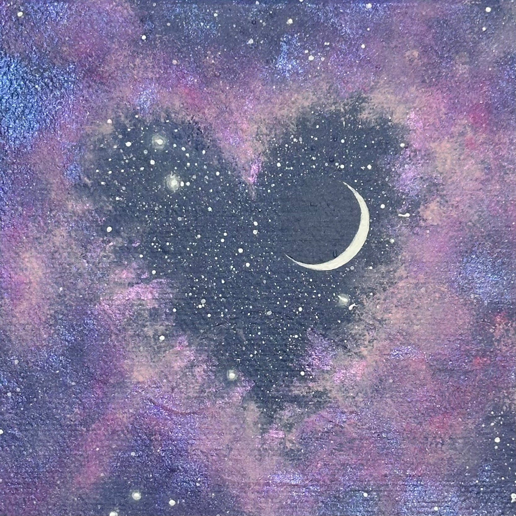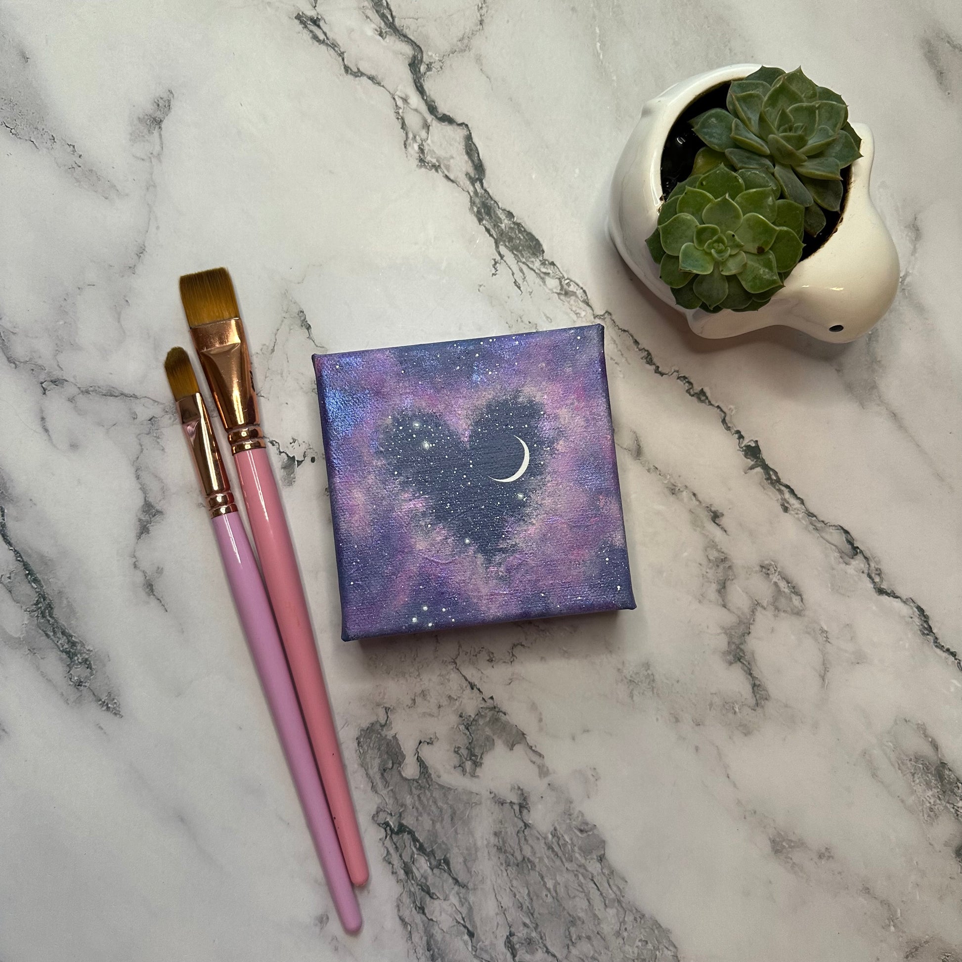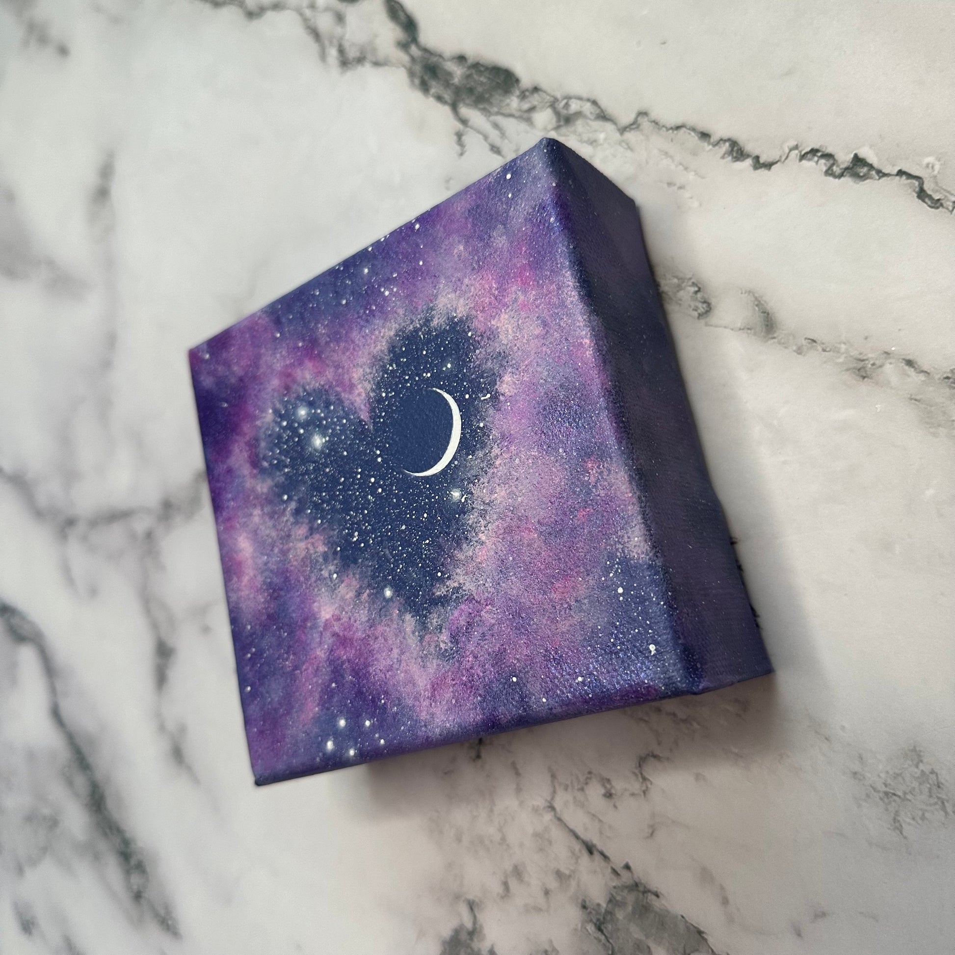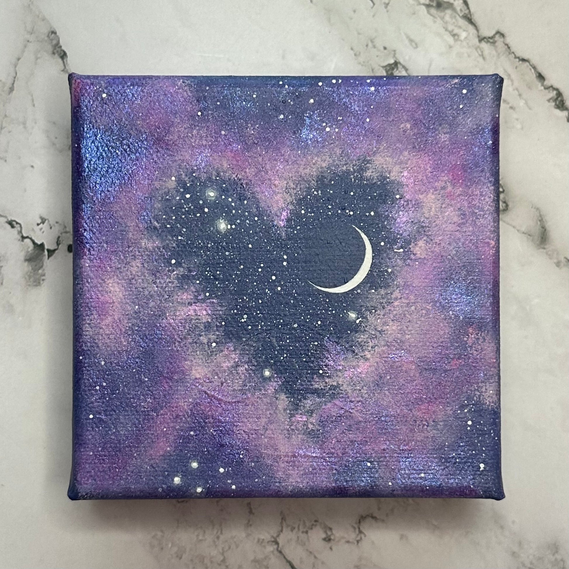Experience the magic of our dreamy heart clouds painting, featuring vibrant shades of purple and a captivating crescent moon. Let its whimsical hues transport you to a peaceful and enchanting place. Perfect for adding a touch of charm and wonder to any space.