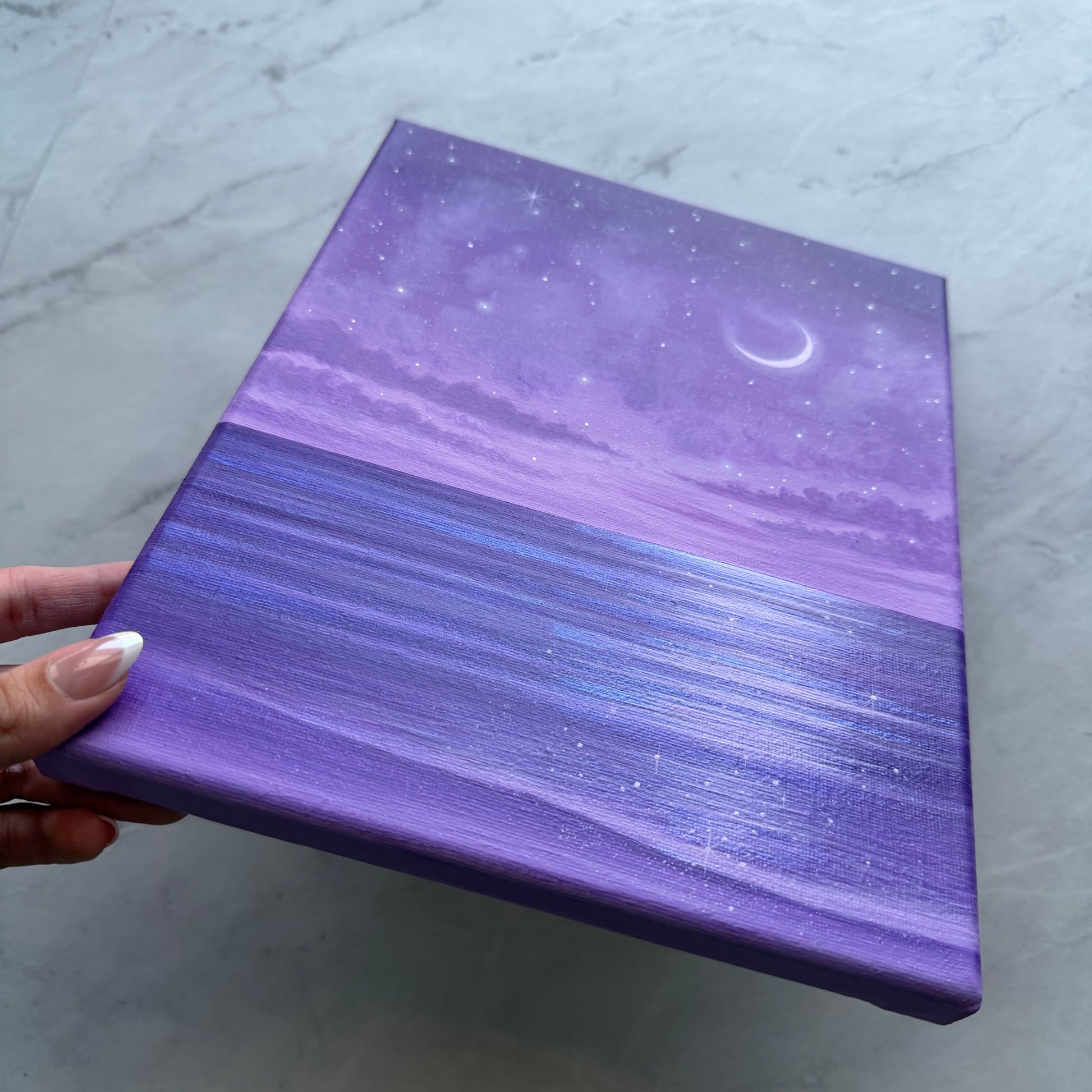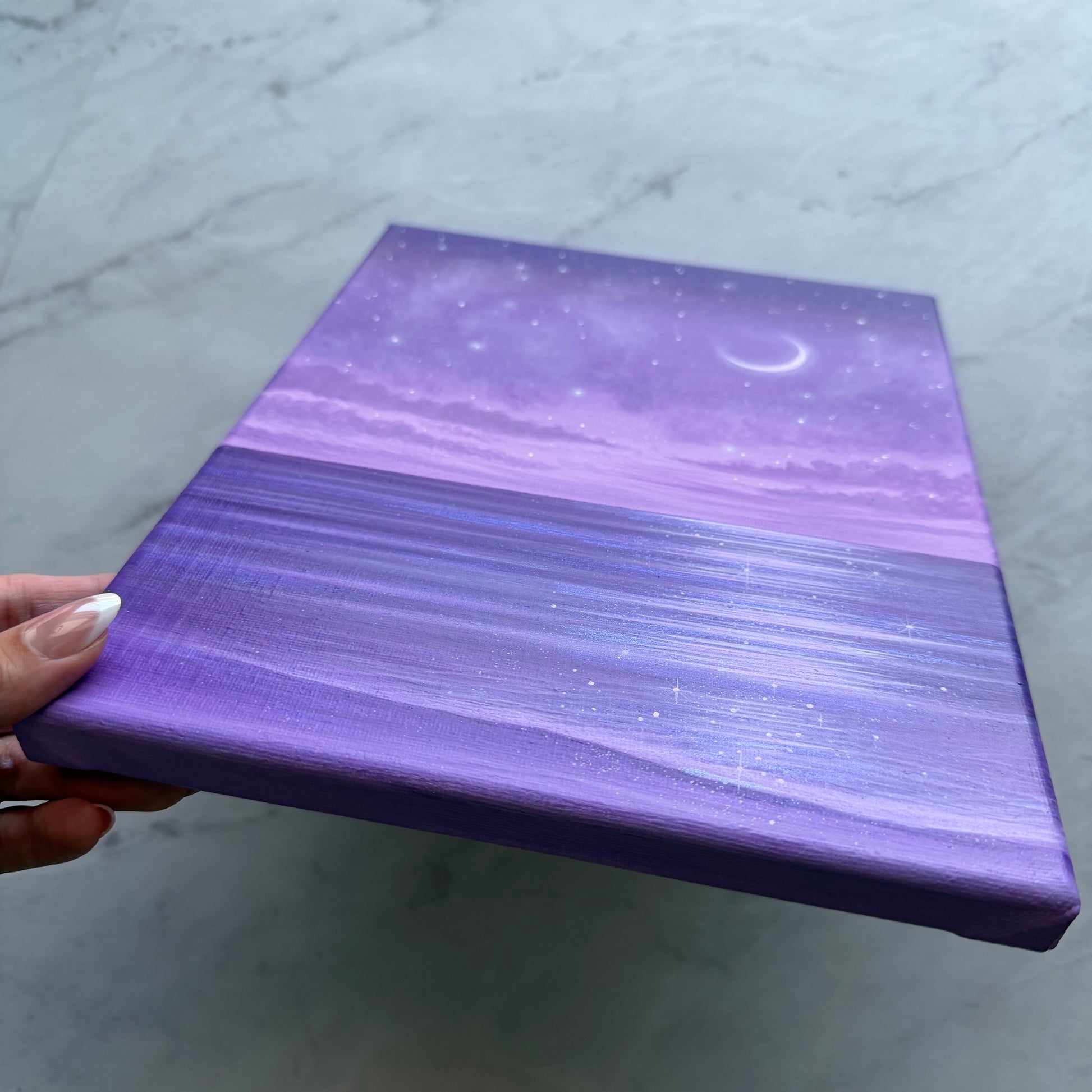 Painted on an 8 × 10 inch stretched canvas, this original piece adds a calm, celestial touch to any space. 🌙✨💜🌊