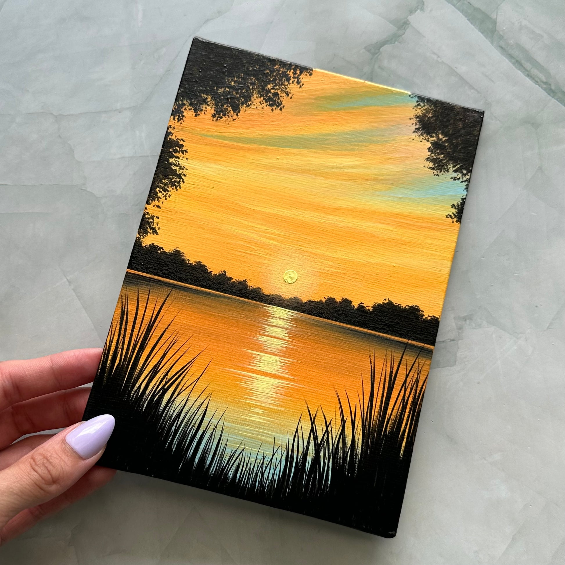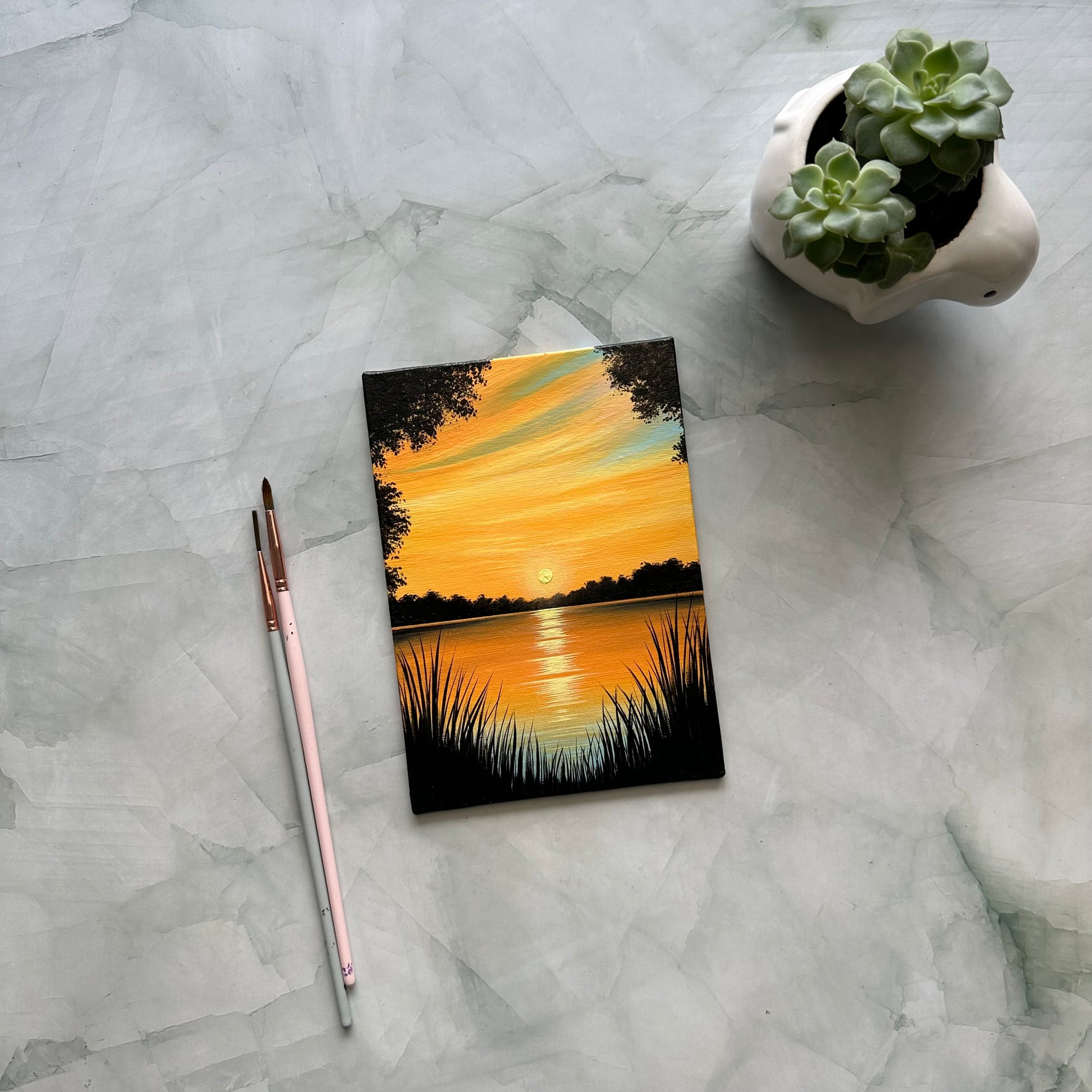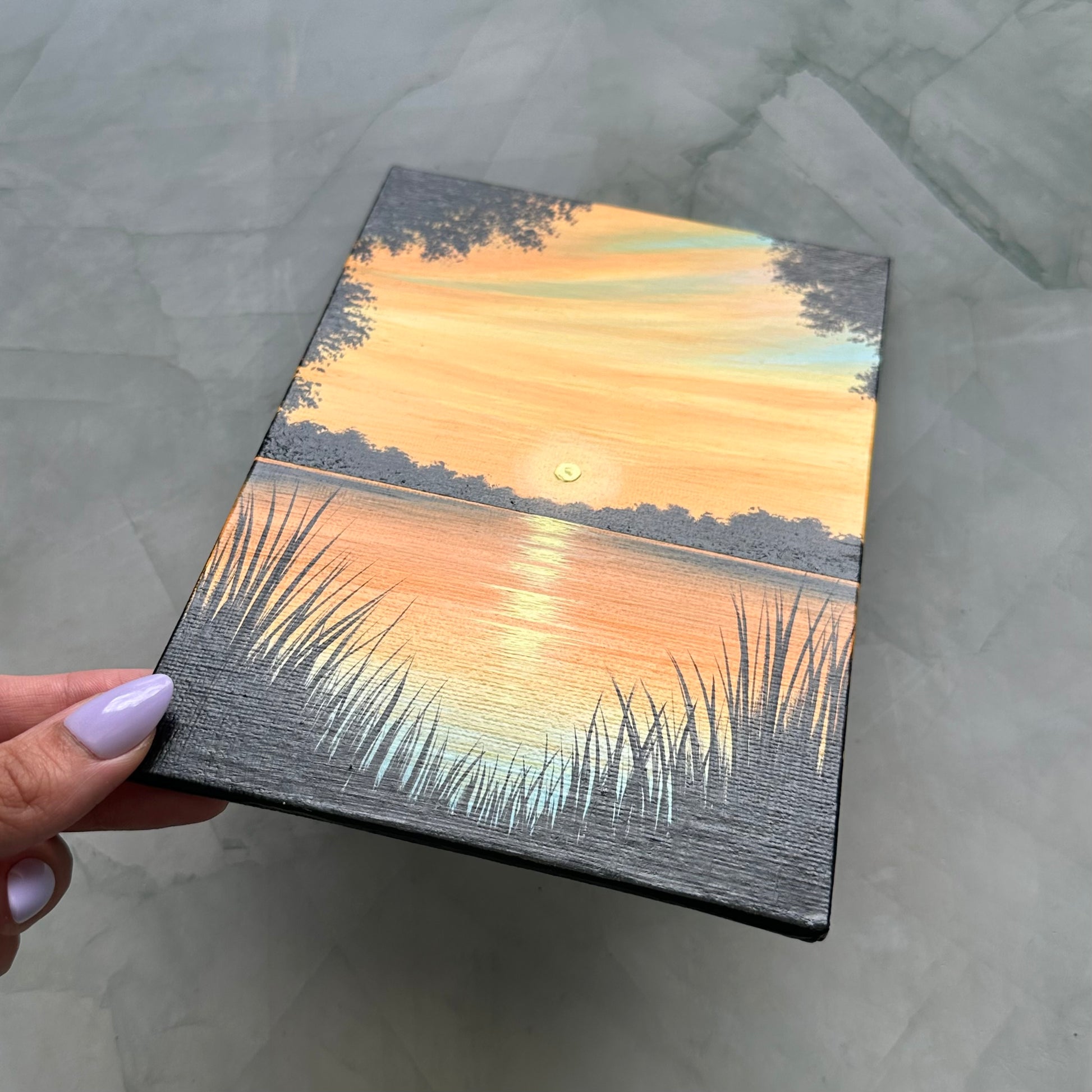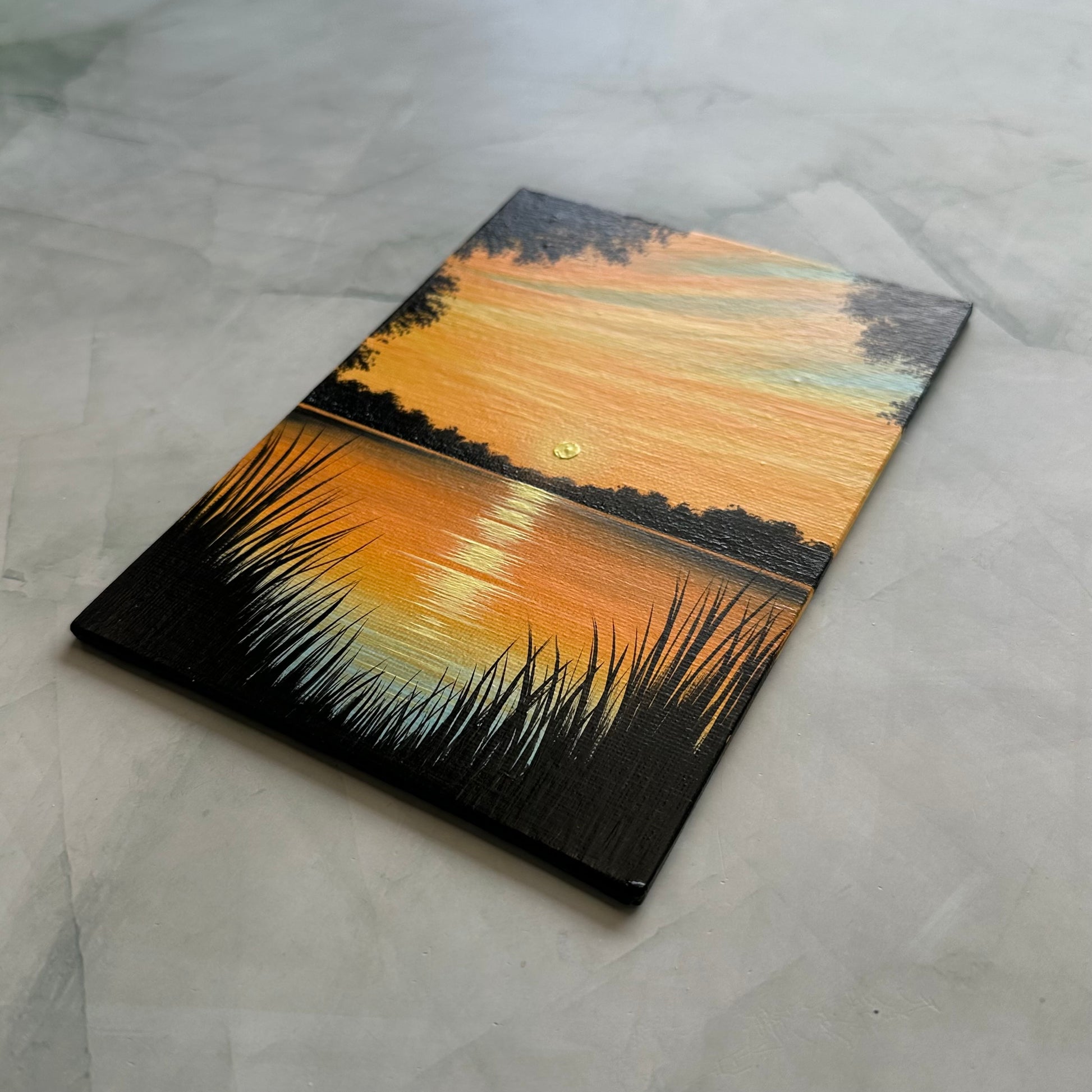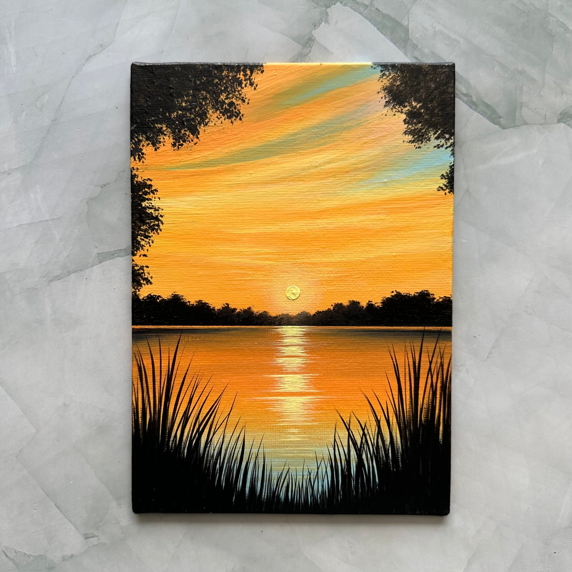 Let Golden Peach Paradise invite you into a warm, golden glow—an original acrylic painting capturing the quiet magic of sunset reflecting over calm waters. Framed by silhouettes of grasses and trees, this peaceful scene is painted in soft peach, honey gold, and touches of sky blue.