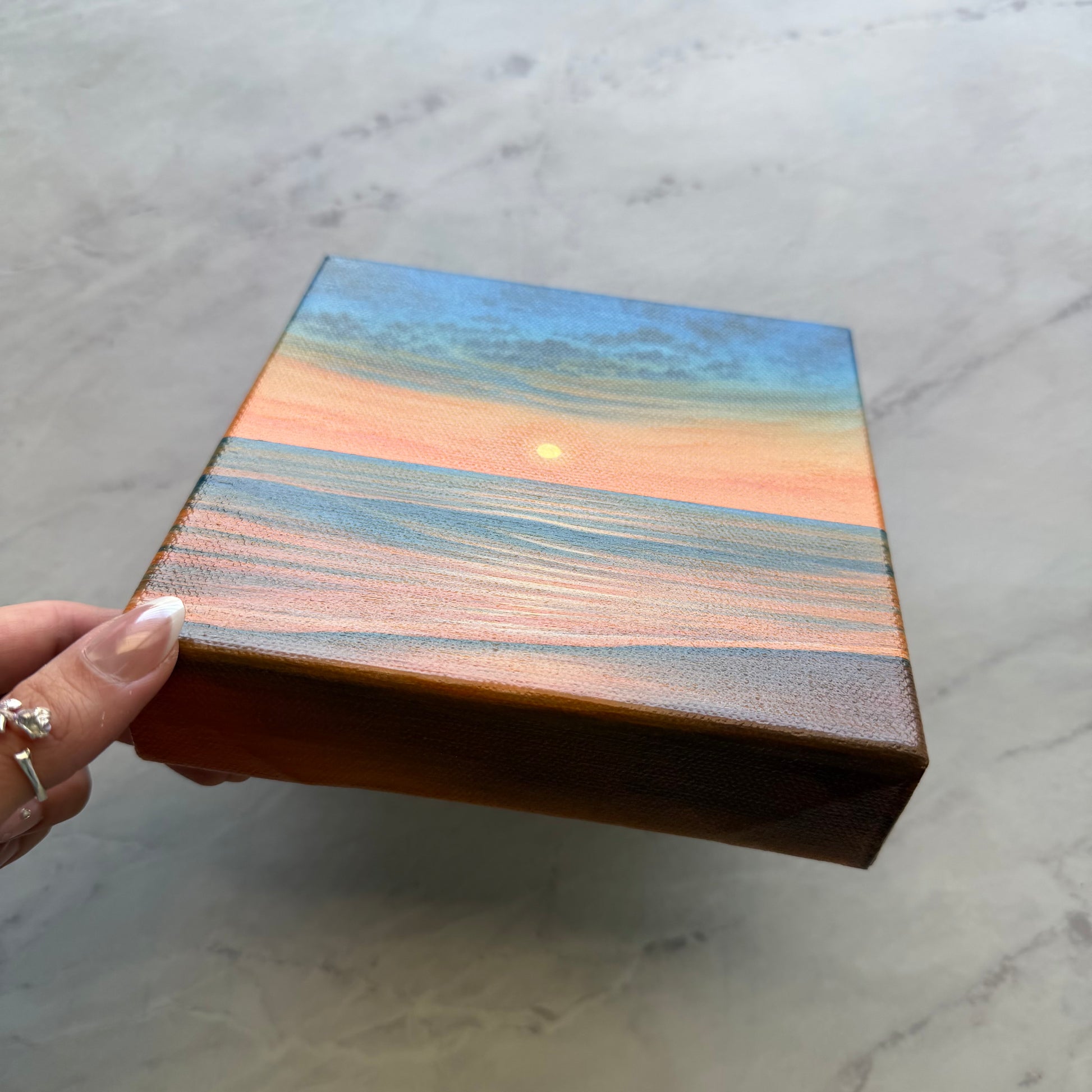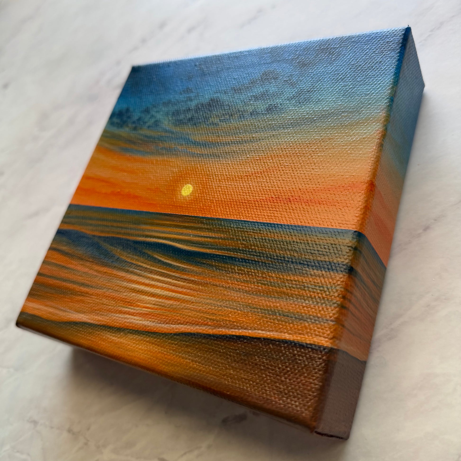 Painted on a 6 × 6 inch chunky stretched canvas, this original piece is perfect for shelves, small walls, or cozy spaces that need a touch of warmth. 🌅🧡