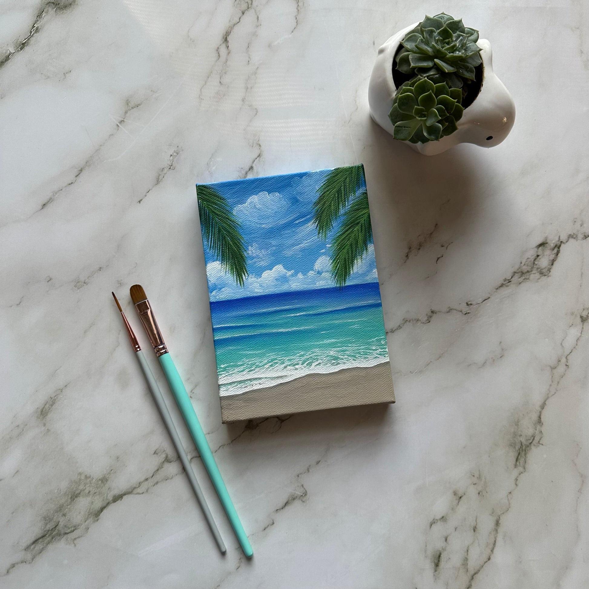 Transform your home into a tropical paradise with this "life's a beach" painting. Immerse yourself in the stunning oceanside painting, complete with vibrant palm trees and calming waves. The dreamy fluffy clouds and lovely shades of blue will transport you to a tranquil state. Bring the beach home and let its beauty inspire you.