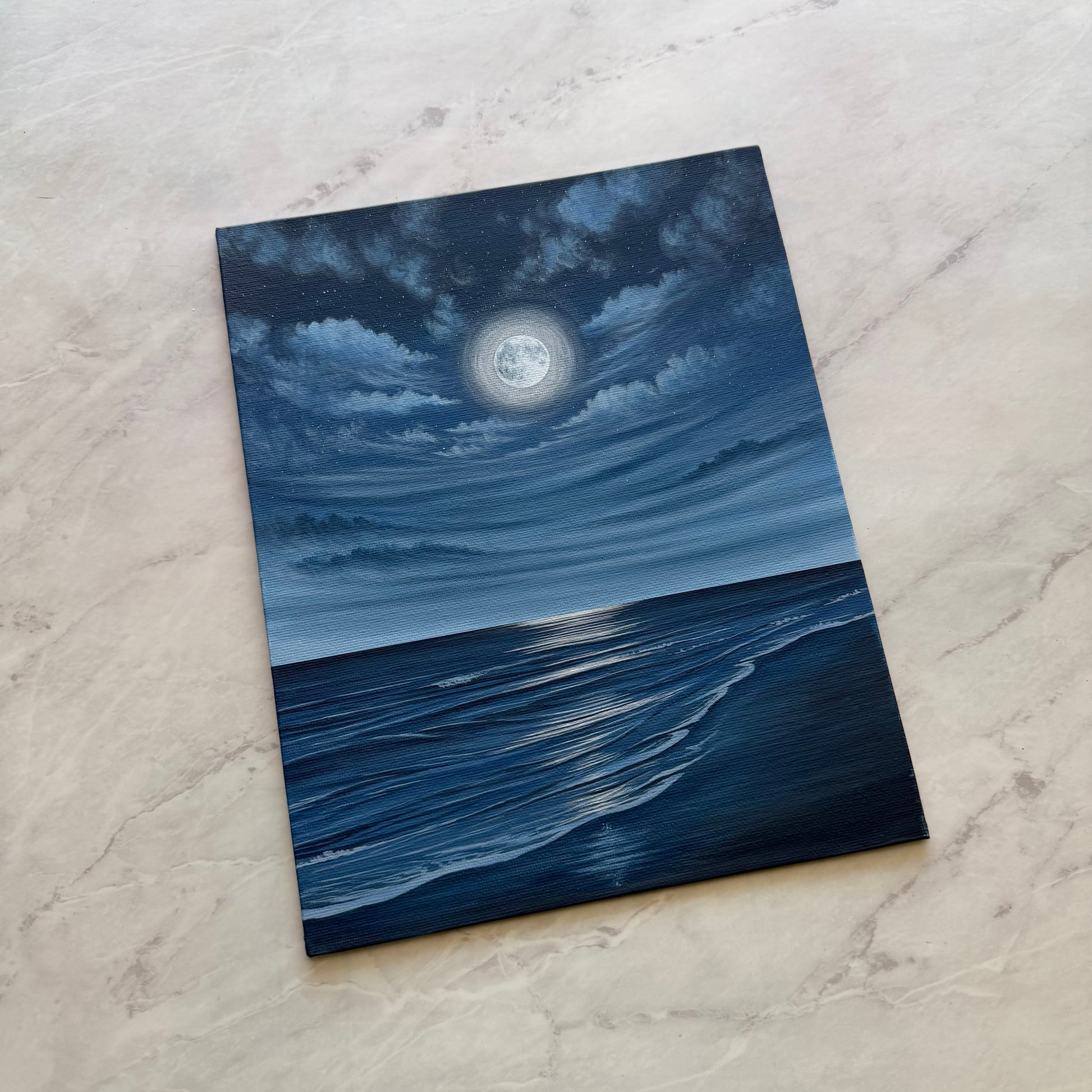 Painted on an 8 × 10 inch canvas panel, this original piece brings a peaceful, nighttime calm to any space. 🌊