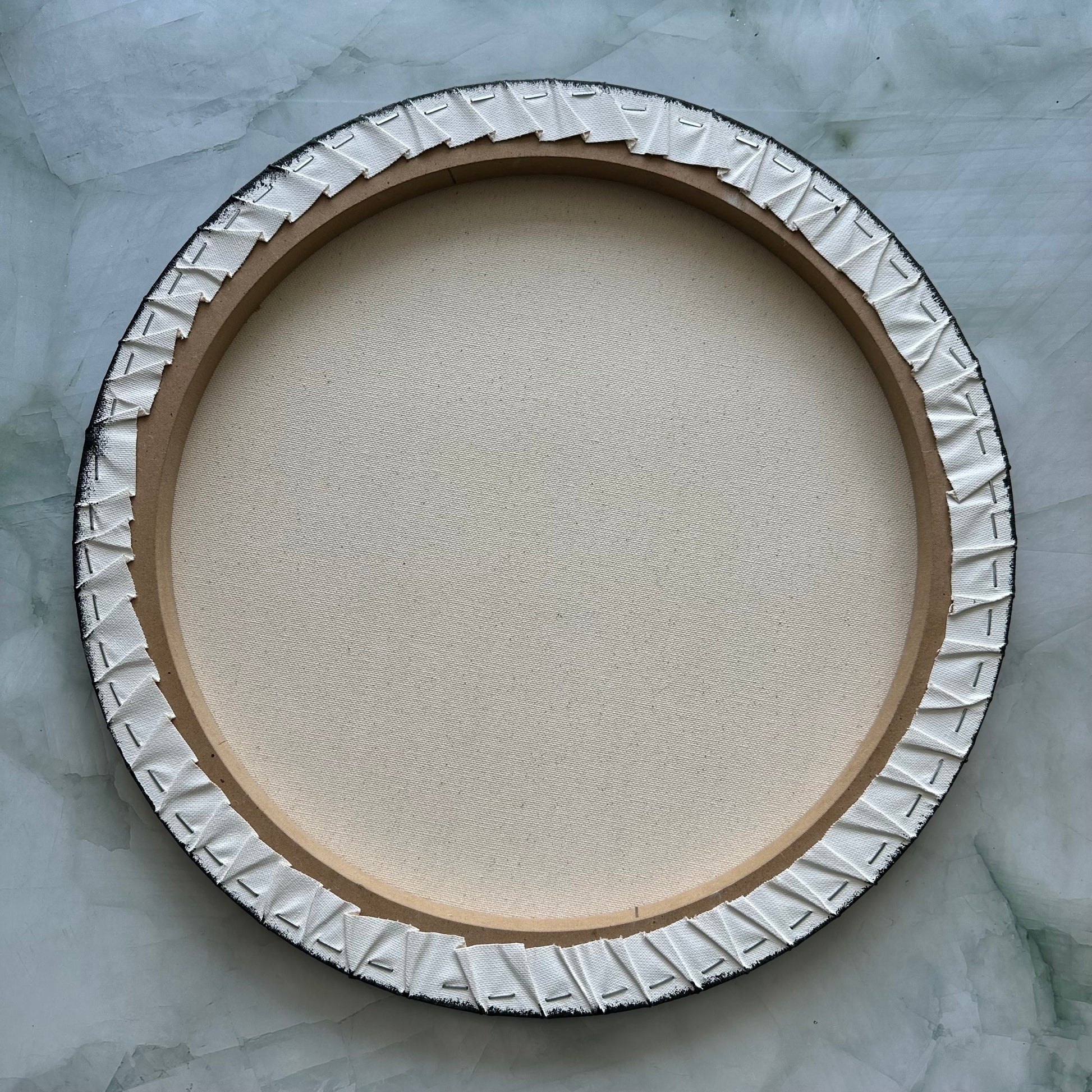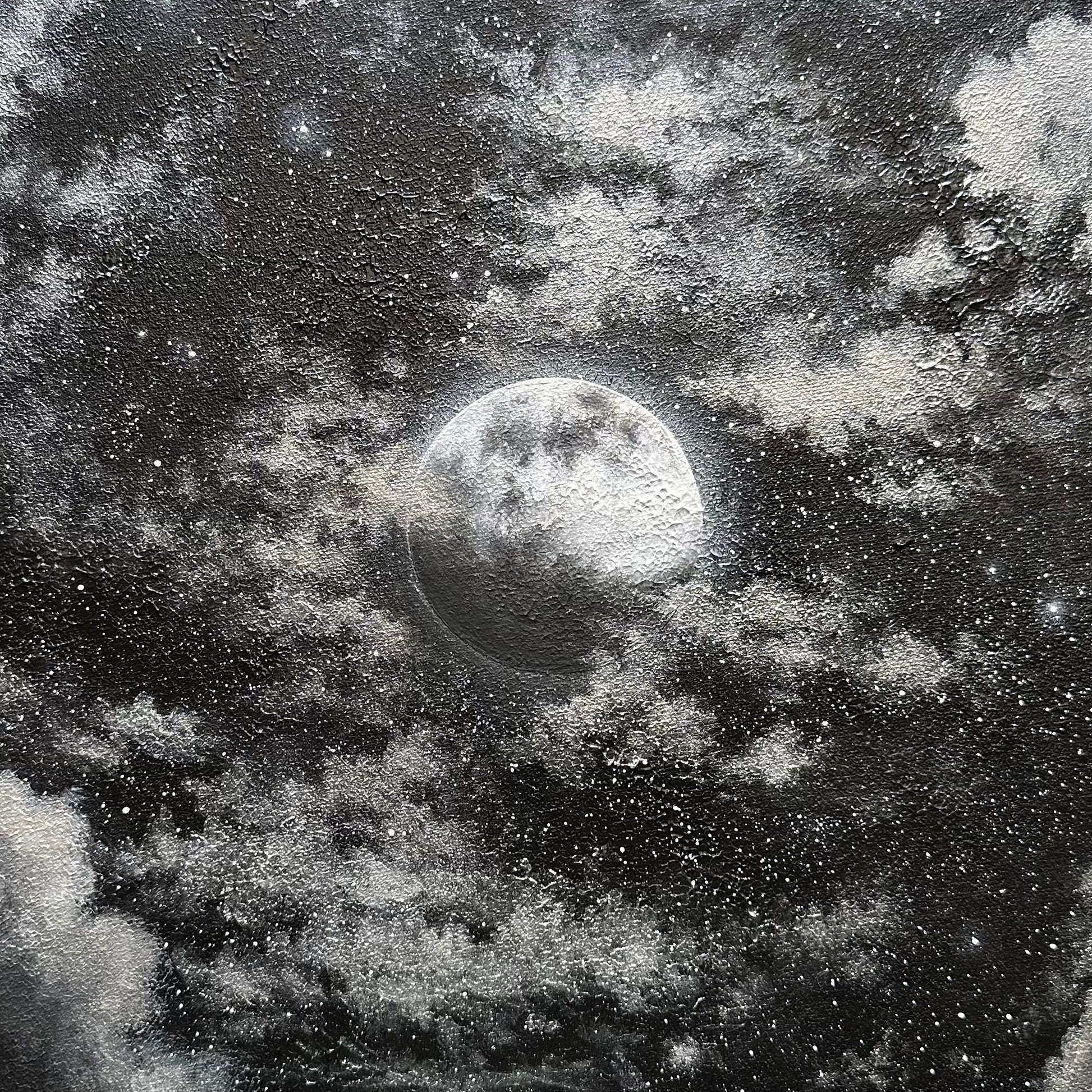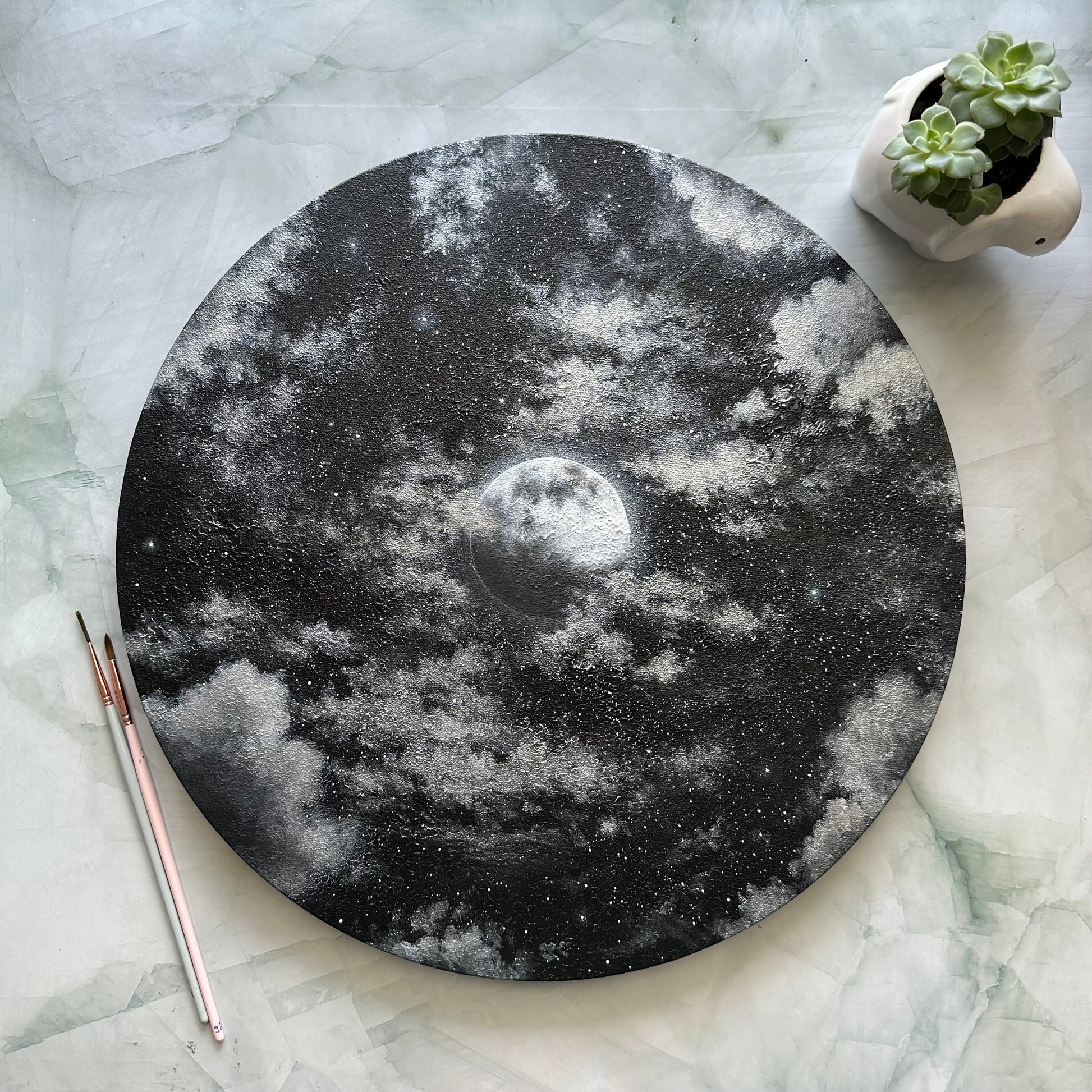 Lose yourself in the celestial depths of Moondrift—an original 16-inch round canvas painted with high-quality acrylics. This monochrome dreamscape captures the moon drifting through a veil of clouds and stars, evoking a quiet night suspended in space and time.