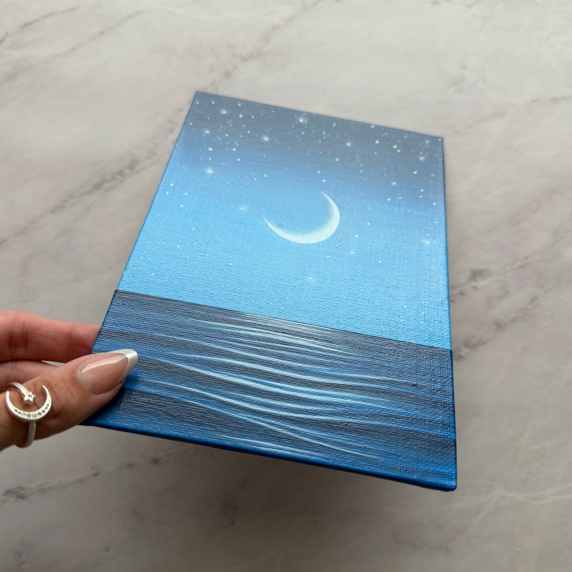 Painted on a 5 x 7 inch canvas panel and signed on the back, this one-of-a-kind original brings soothing ocean-night magic to any space. 🌙✨🌊