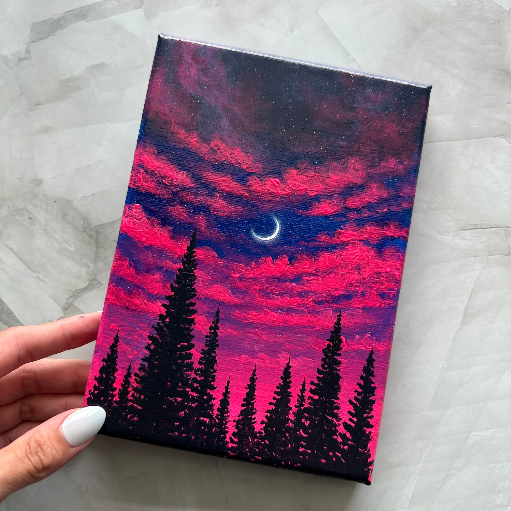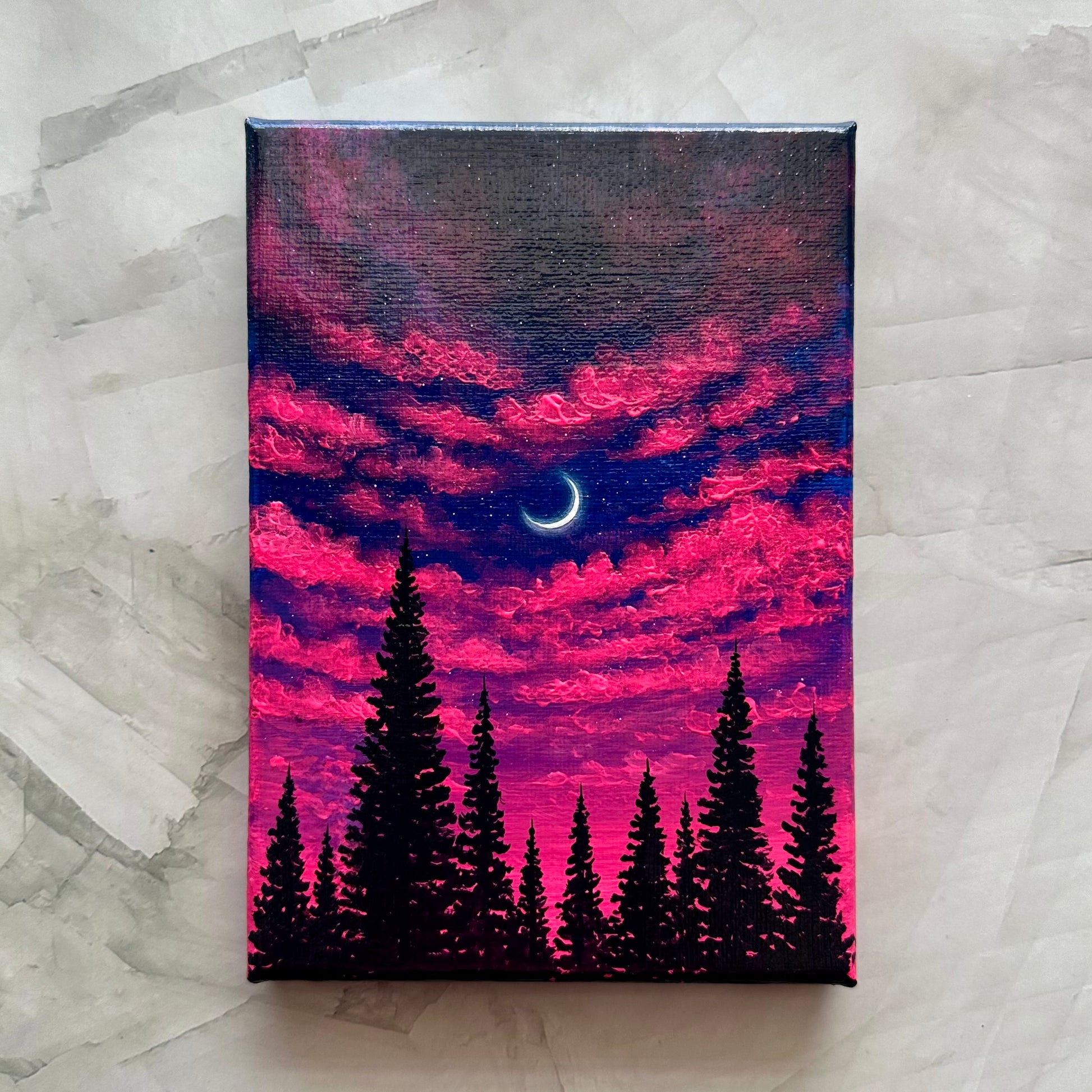Neon Hush is a moody dreamscape where vibrant pink clouds swirl through a deep indigo sky. A crescent moon glows above the trees, casting a quiet, electric energy. Painted on stretched canvas and signed on the back—this one-of-a-kind piece brings bold color and calm to any space. 🌙🌲