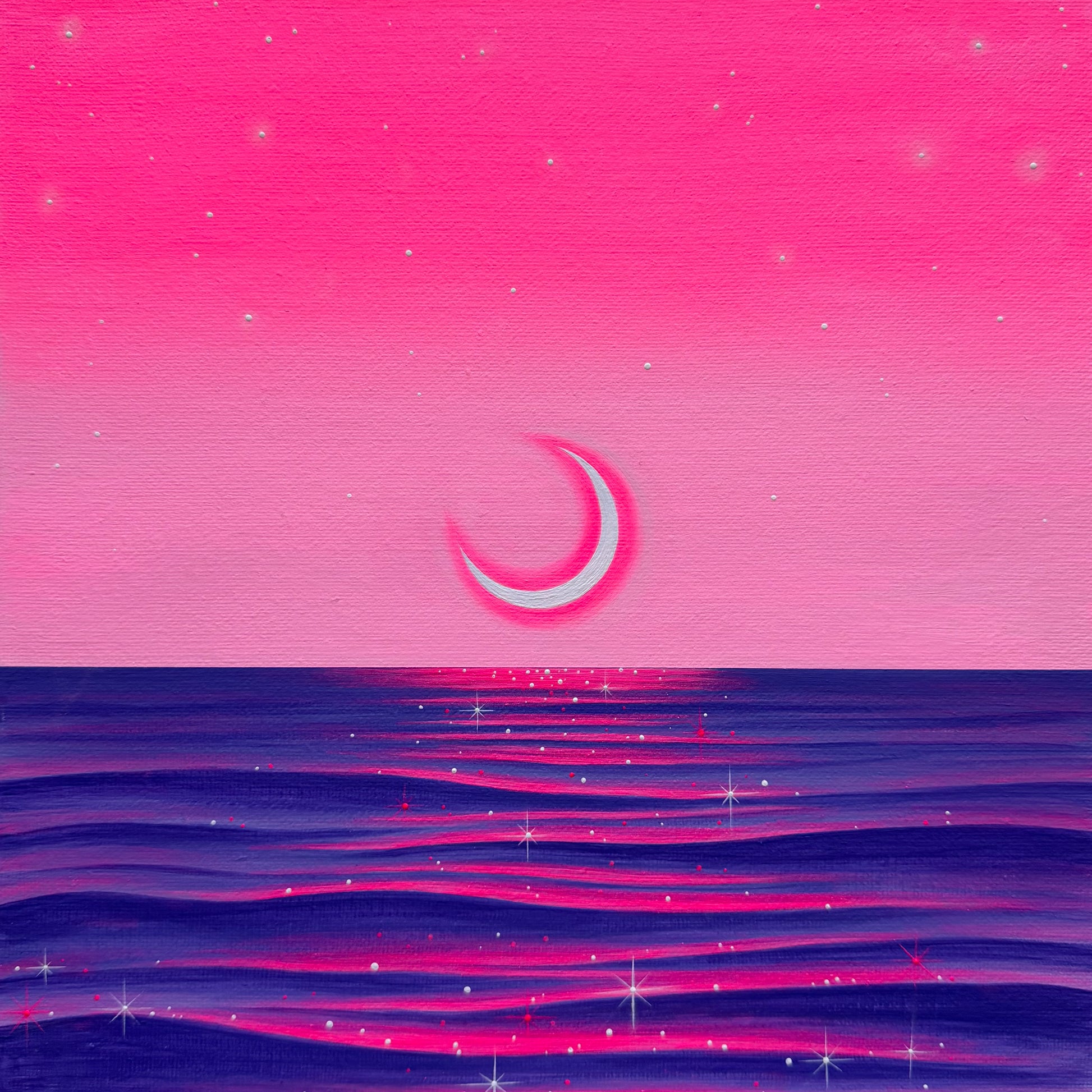 A crescent moon rises above glowing waves, surrounded by vibrant shades of neon pink and violet. Neon Ocean Glow captures the beauty of light meeting color—a luminous dream where the ocean shimmers like starlight.