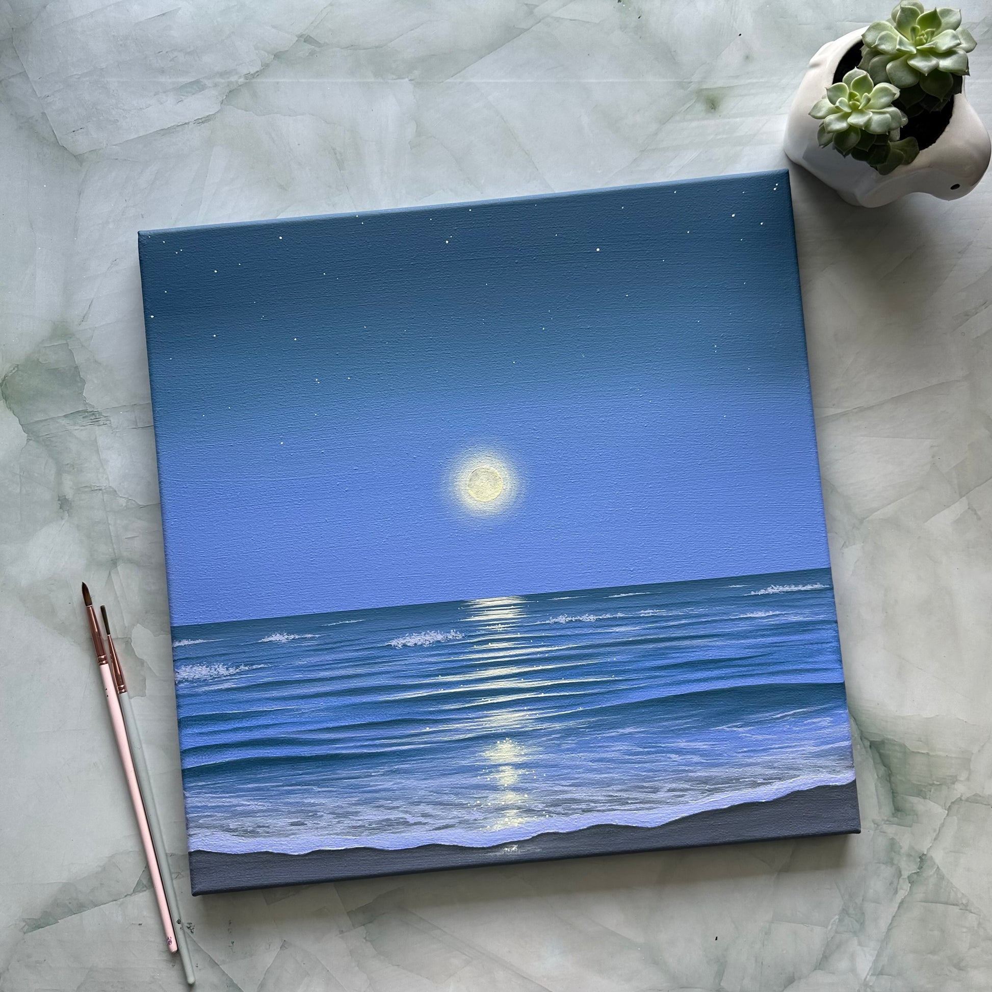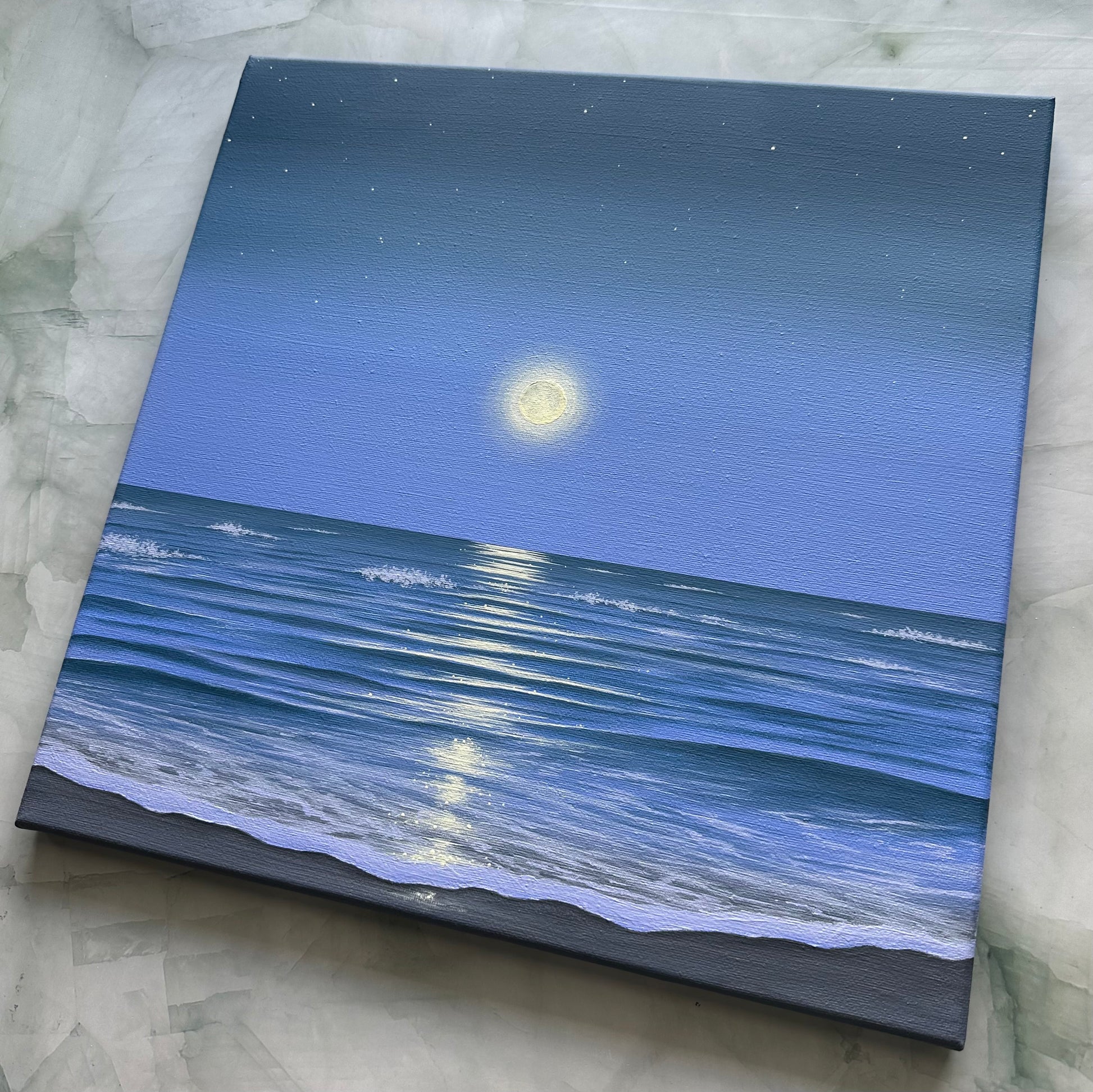 Let the calm of Moonlit Escape wash over you—an original, one-of-a-kind acrylic painting capturing the serene glow of the full moon reflecting across gentle ocean waves. Soft shades of blue and shimmering highlights evoke a peaceful night beneath the stars, where the sea meets the sky in quiet harmony.