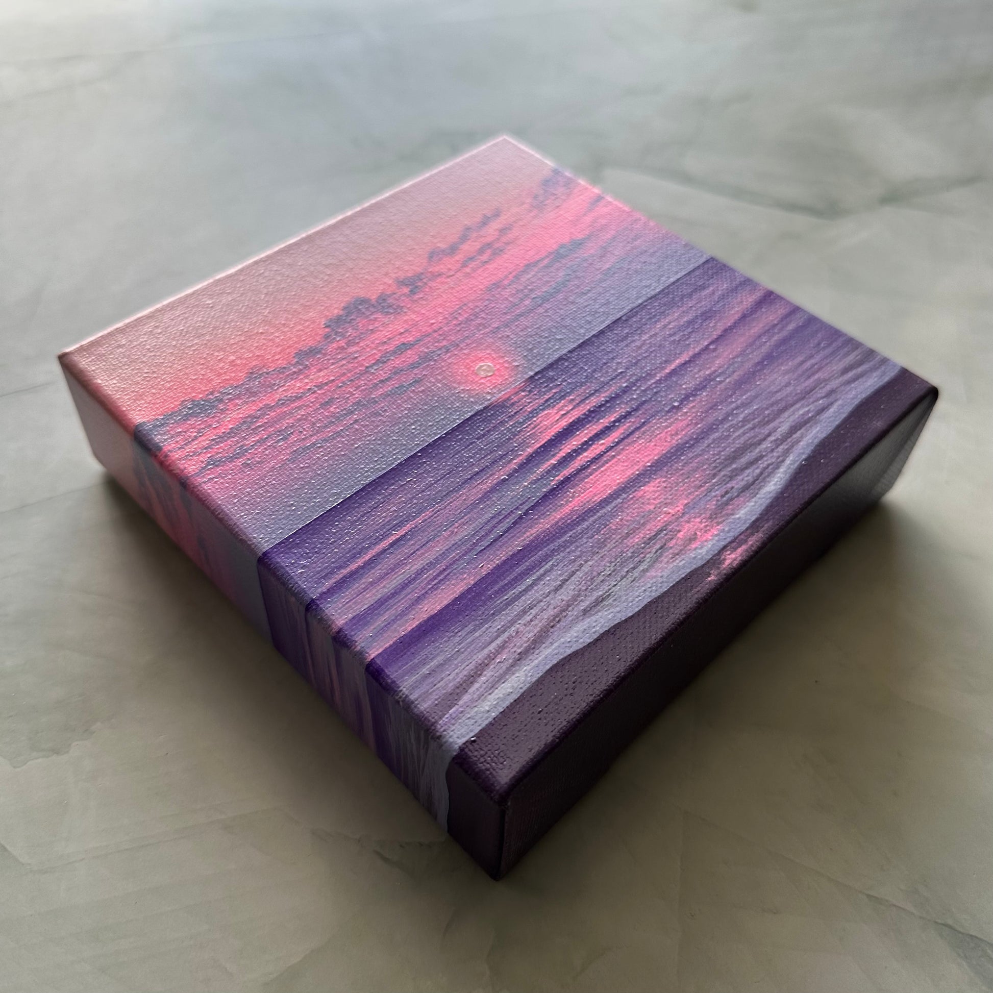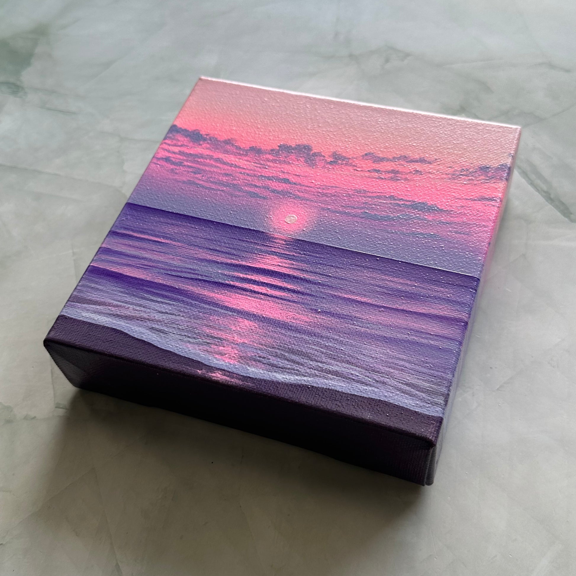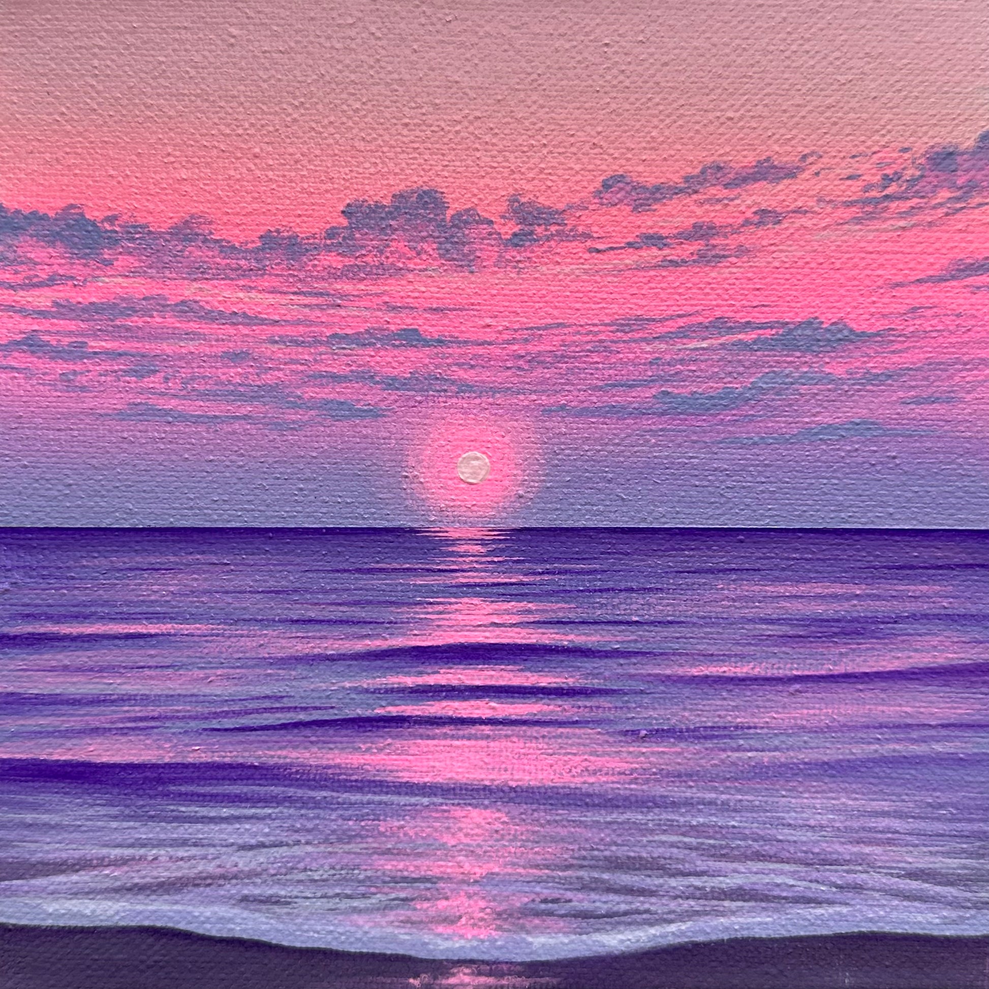 A tranquil sun hovers above gentle tides, casting a soft glow across serene waters bathed in lilac and rose. Delicate clouds stretch across a cotton-candy sky, their edges kissed with hints of lavender and blush. This dreamy seascape captures the peaceful stillness of a moment when the world is quiet and the colors of day and night softly blur. Painted with care on stretched canvas and signed on the back, this original acrylic piece invites calm, warmth, and reflection into any space. 🌸🌊